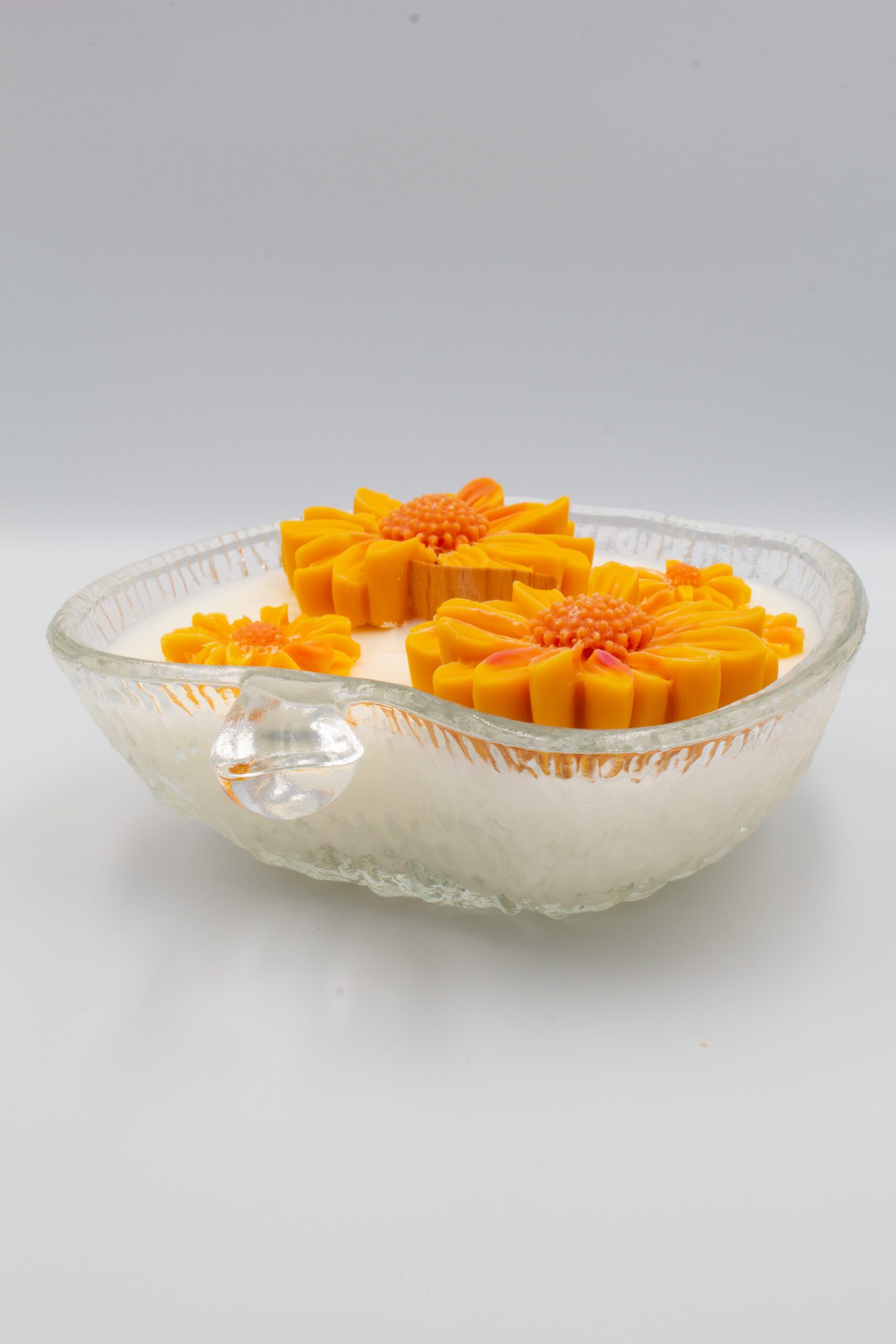 Świeca w szklanym naczyniu w kształcie jabłka, o zapachu Gruszka & jabłko wprowadzi do naszych wnętrz soczystą świeżość owoców. Zapach gruszki przenosi nas do wspomnień o sadzie pełnym owoców, jabłko i wanilia przypominają o miłych chwilach przy ciepłej szarlotce.  Ozdobiona została kilkoma różnymi kwiatkami wykonanymi z wosku sojowego.