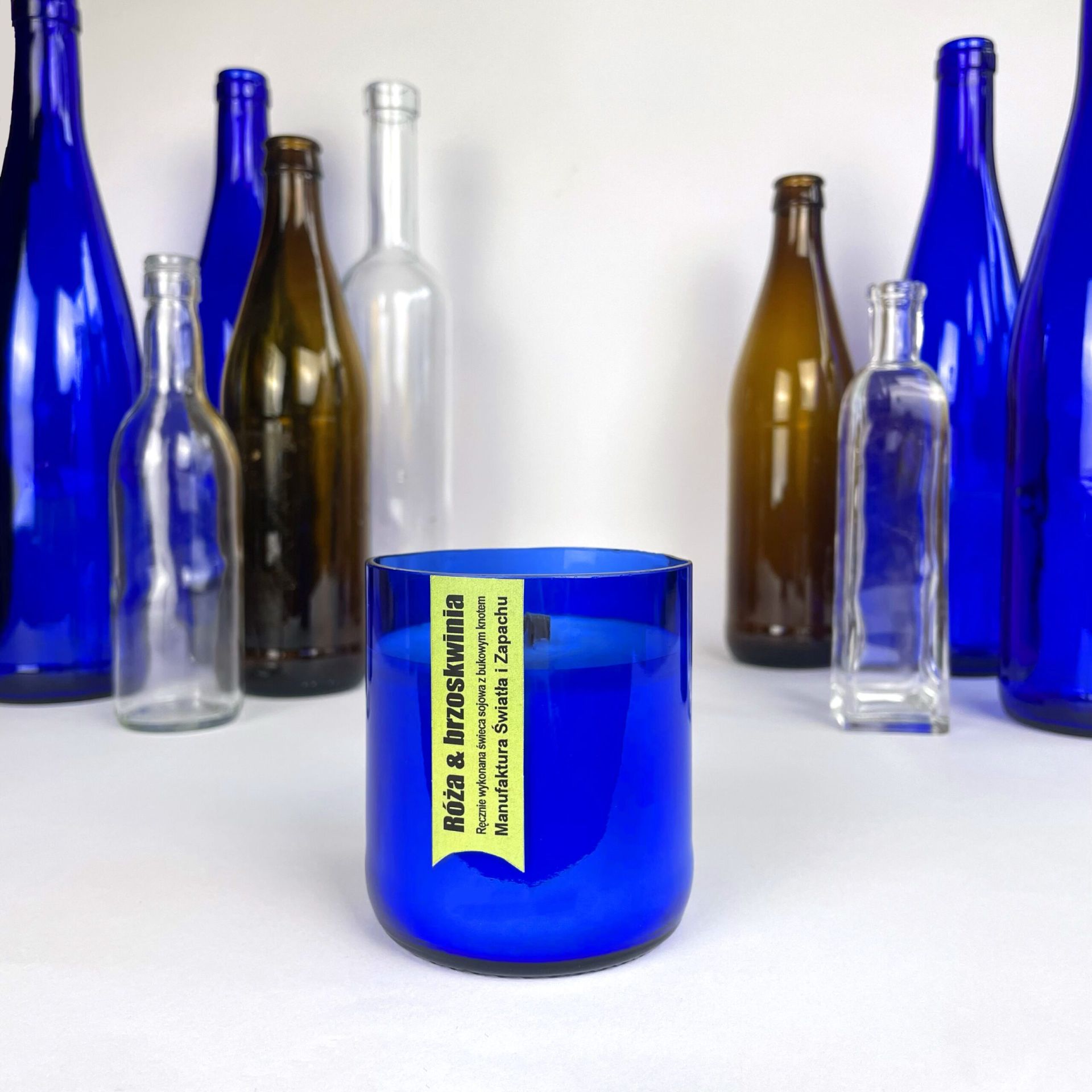 Niebieskie naczynia w których zalewamy świece pochodzą z recyklingu. Są to butelki po bardzo popularnym w Polsce winie, sami je zbieramy a następnie tniemy i tworzymy naczynia.