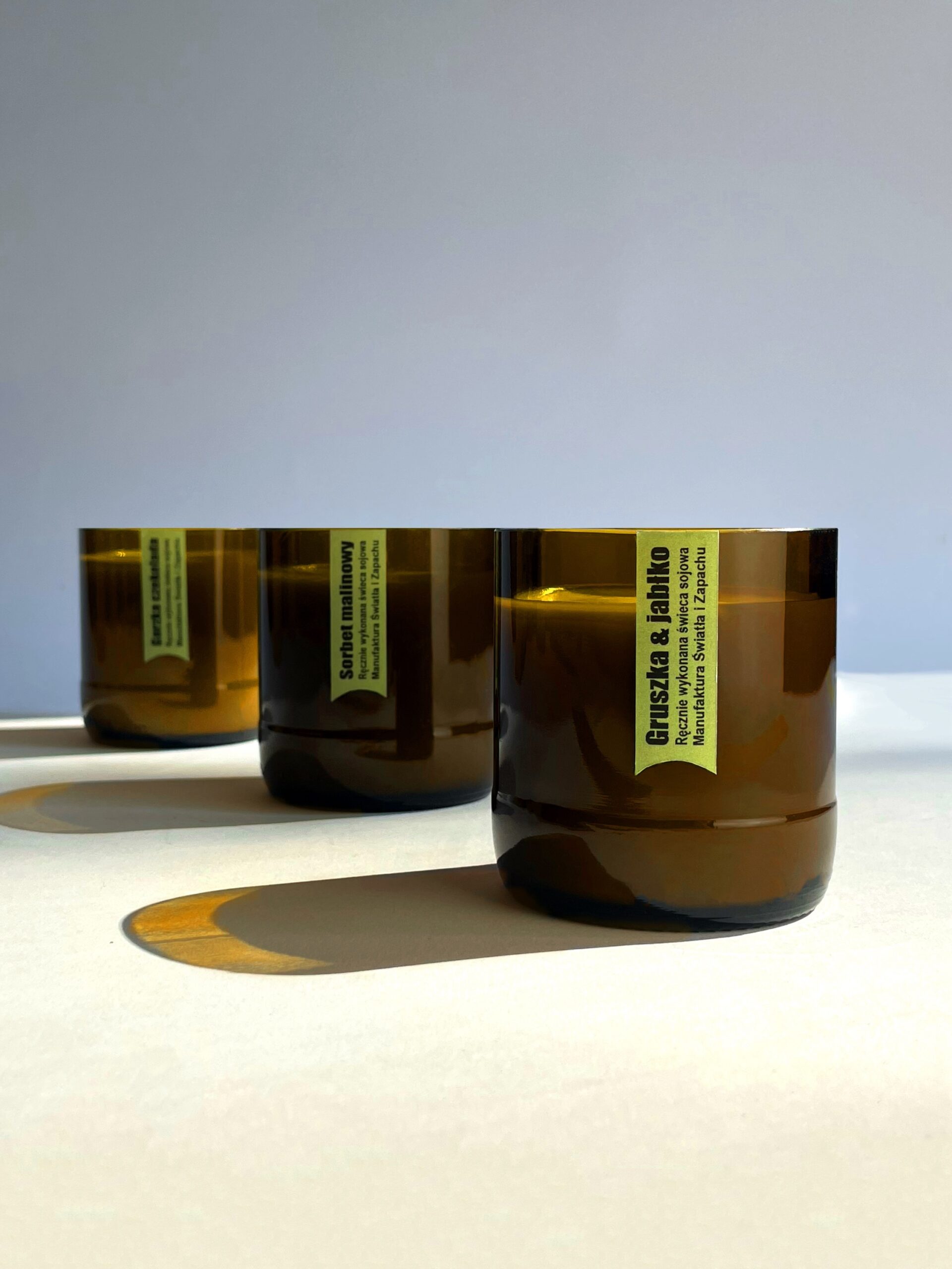 Bardzo ważne jest dla nas zdrowie odbiorców naszych produktów ale również zdrowie naszej planety. Dlatego postanowiliśmy połączyć świece wykonane z naturalnych składników oraz naczynia z recyklingu. Wszystkie etapy produkcji wykonywane są ręcznie, od odklejania etykiet z butelek, przez ich cięcie i szlifowanie, aż po wklejanie knotów, zalewanie świec i naklejanie naszych etykiet. I tak właśnie powstają nasze sojowe świece w butelkach.